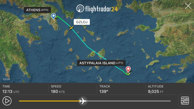 We flew at 9,000 ft for the 1 hour flight to Astypalea. There's no fuel at Astypalea so we needed to make sure we landed with enough to get back to Athens.