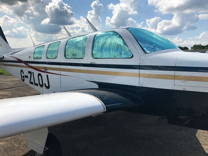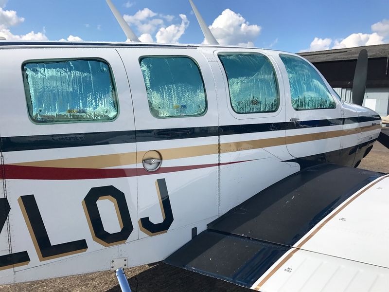 The Bonanza is a wonderful touring aircraft and one of the things that you need to carry is an aircraft cover of some kind. I’ve had a Cambrai cover since 1998 and it’s holding up well. The only snag is it weighs 12 lb, so I’ve just got hold of some internal sunscreens for our upcoming trip to Austria, Serbia, Greece, Slovenia and France.