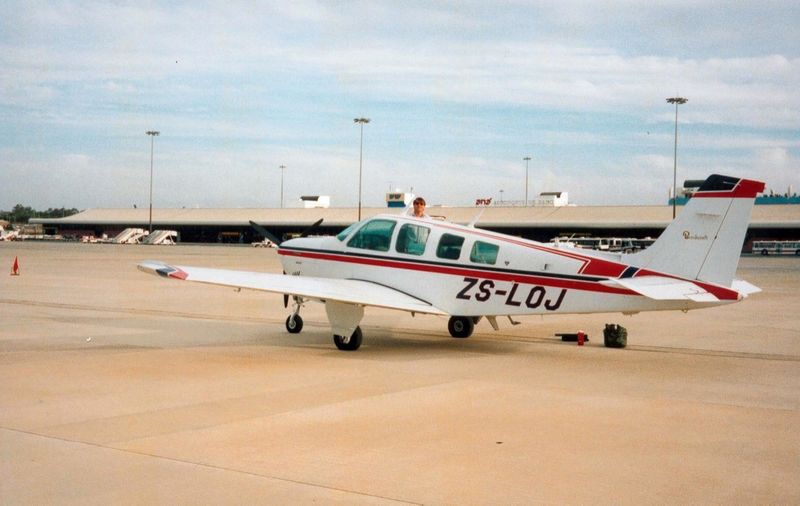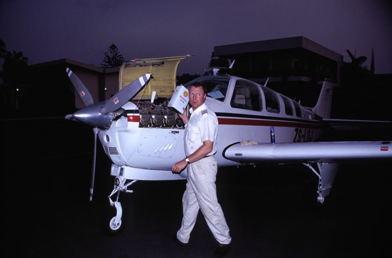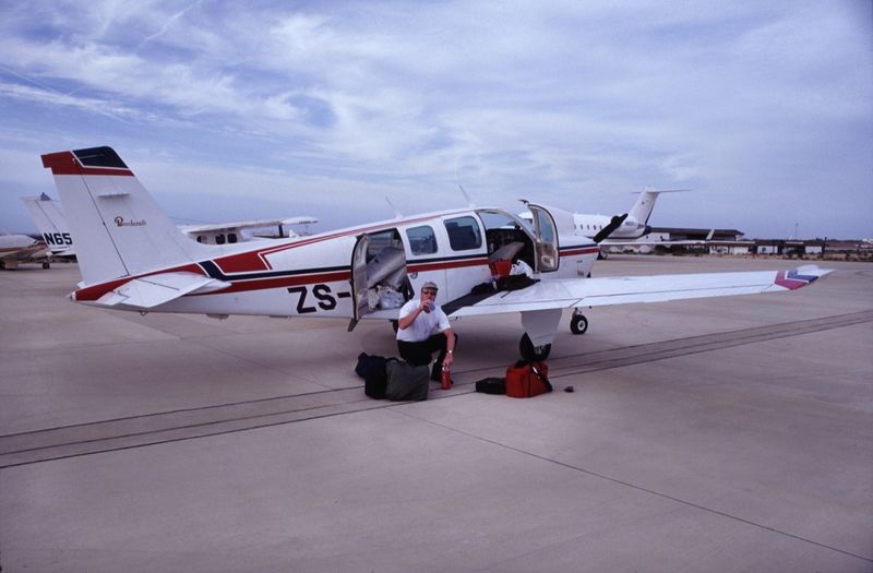 We were back at Windhoek International at a comfortable 7:30 local with an hour to go to our planned departure time. I filed the flight plan, paid the landing fee and checked the weather (severe clear as far as the local met-man could tell), while Steve pre-flighted the Bonanza and then set off on an expedition to refill our coffee flask. This he achieved by walking up the steps of a parked Air Namibia Airbus and scrounging the coffee from the inflight galley. I was then able to blame him for the ten-minute delay in our departure, but at least we had coffee!