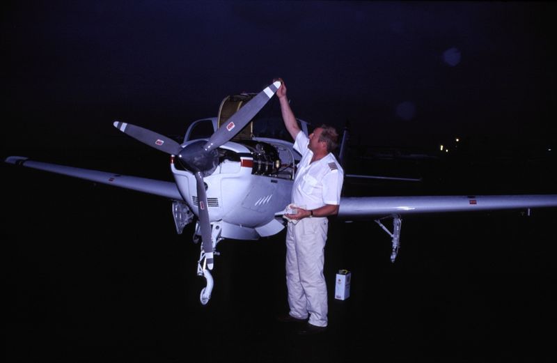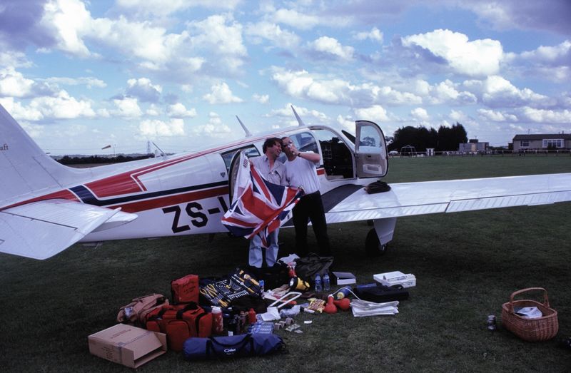 The estimated flight time was 7:36 so a take-off at 0755 Zulu would be spot-on. Just to be safe, we took off 5 minutes early, figuring it would be easier to lose the time than make it up. Northbound over Portugal the headwind component got stronger and stronger and we slipped from 5 minutes up to 15 minutes down. “Don't worry," said Steve, “It’ll change to a tailwind as soon as we set out across the Bay of Biscay". “Yes, but what if it doesn’t?" I replied, easing the rpm up to 2500. As usual, he was right and I was wrong. By the time we crossed the French coast and turned at Nantes we were 15 minutes ahead of schedule, despite reducing the rpm back to 2200 and, for the first time ever, reducing the manifold pressure in the cruise back to 22 inches. After turning at Jersey we were talking to London, probably the first time they’d heard a ‘ZS’ callsign from a light aircraft. We cancelled IFR over Compton VOR and let down for a quick flypast at Denham (EGLD) before turning north again, now at 2,000 feet, for the last 20 minutes up to Sibson. We got there at 4:20 local, and after five days’ flying, it seemed ridiculous to fly around in circles just to land at half past, so I gave up gracefully and we landed just as the family car drove onto the airfield. We didn’t drink red wine that night, we drank champagne!